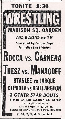 Manhattan, New York: Monday, January 14, 1952 (Madison Square Garden) ... Primo Carnera and Antonino Rocca drew at the curfew (21:00) ... Gene Stanlee b. Don Jarque (27:15) ... NWA World Heavyweight Champion Lou Thesz b. Bobby Managoff (24:54) ... Ilio DiPaolo b. Adrian Baillargeon (9:24) ... Dick Steinborn b. Mike Clancy (12:57) ... Don Leo Jonathan b. Kola Kwariani (4:43) ... Ace Freeman and Arnold Skaaland drew ... (promoter: Charles Johnston) ... (referee: Johnny Garan Jr.) ... (9,000 fans) ... (gate: $26,901.82) Notes: Benefit for the Italian Flood Victims sponsored by Fortune Pope. No television or radio of the matches. Johnston's offices was at 1476 Broadway, room 809. A crowd of 15,000 paying $50,000 was expected. The New York Times stated that wrestling had been out of the Garden for "a year." Mayor Impellitteri was in attendance. Research by Tim Hornbaker |